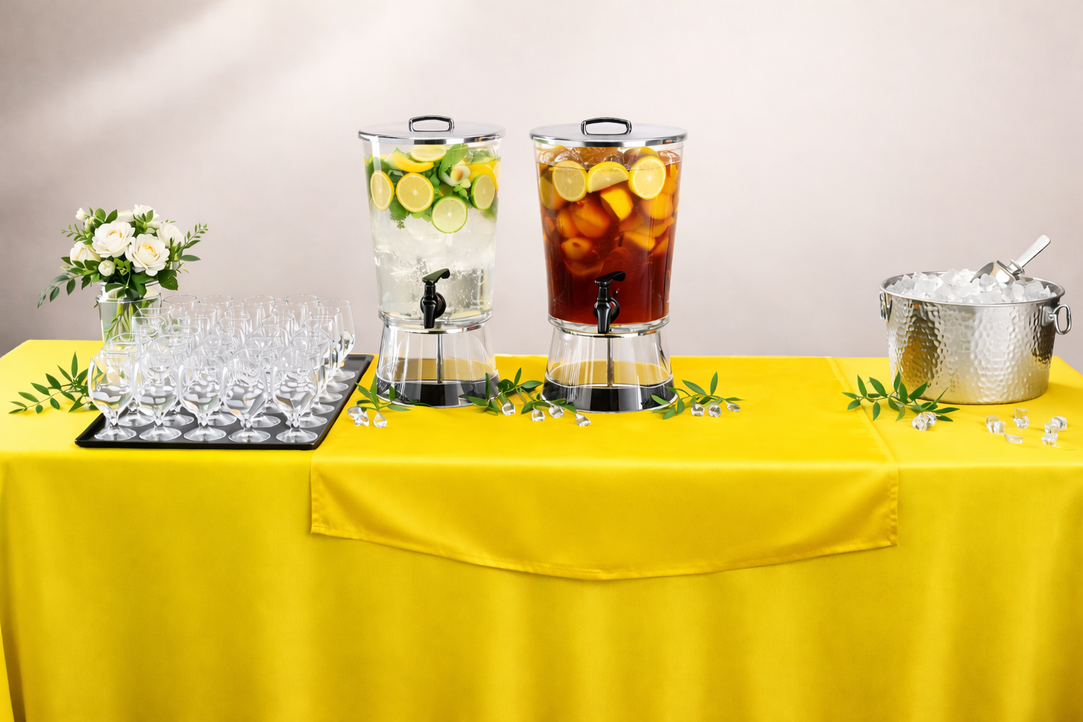Our Beverage Station Bundles are designed to complement your buffet and tent packages. Each bundle includes coordinated tables, linens, and beverage dispensers to create a clean and polished drink service area.