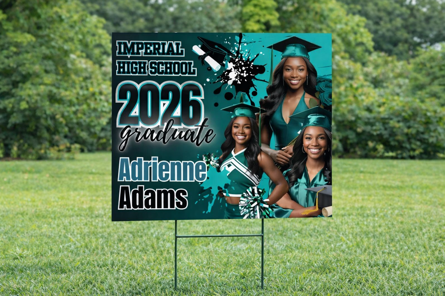 Each sign is designed with your graduate’s photo, name, school colors, and Class of 2026 theme to create a bold and memorable display.