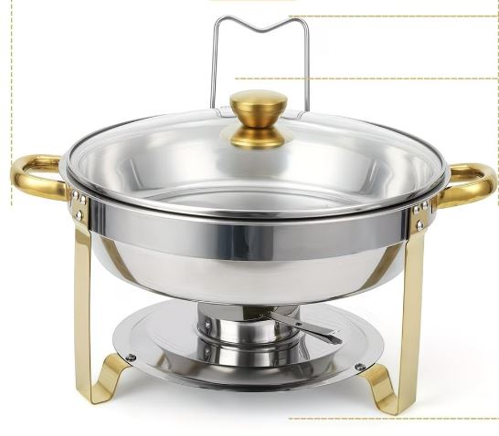 This beautifully crafted chafer features polished stainless steel with warm gold accent handles and legs, paired with a glass lift-top lid for easy viewing and service. Its round design adds a refined touch to weddings, graduation parties, milestone celebrations, and corporate gatherings.